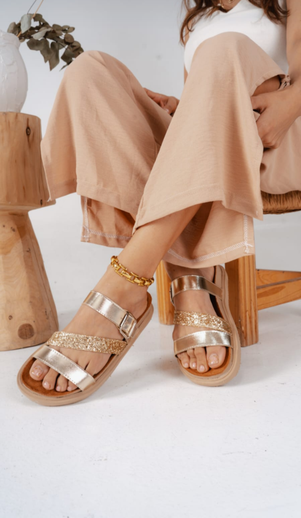 ¡Brilla con Comodidad! Combina el confort de una sandalia plana con un toque de glamour con este modelo de doble tira. Son perfectas para elevar tus looks de día y de noche sin sacrificar la comodidad.