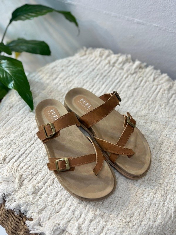 El color suela (o camel/marrón claro) y los detalles en hebillas doradas le dan un toque artesanal y sofisticado. Son súper fáciles de combinar con jeans, vestidos o shorts.